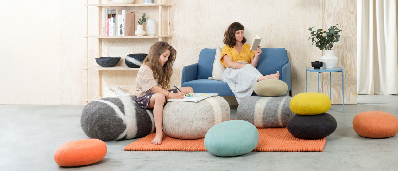 Les poufs unis de myfelt et les galets en feutre réalistes ne sont pas seulement idéaux comme éléments décoratifs de haute qualité dans le salon. Ils sont également populaires comme coussins confortables et naturels ou comme tabouret doux pour l'entraînement autogène, le yoga et la méditation et sont disponibles en différentes tailles.