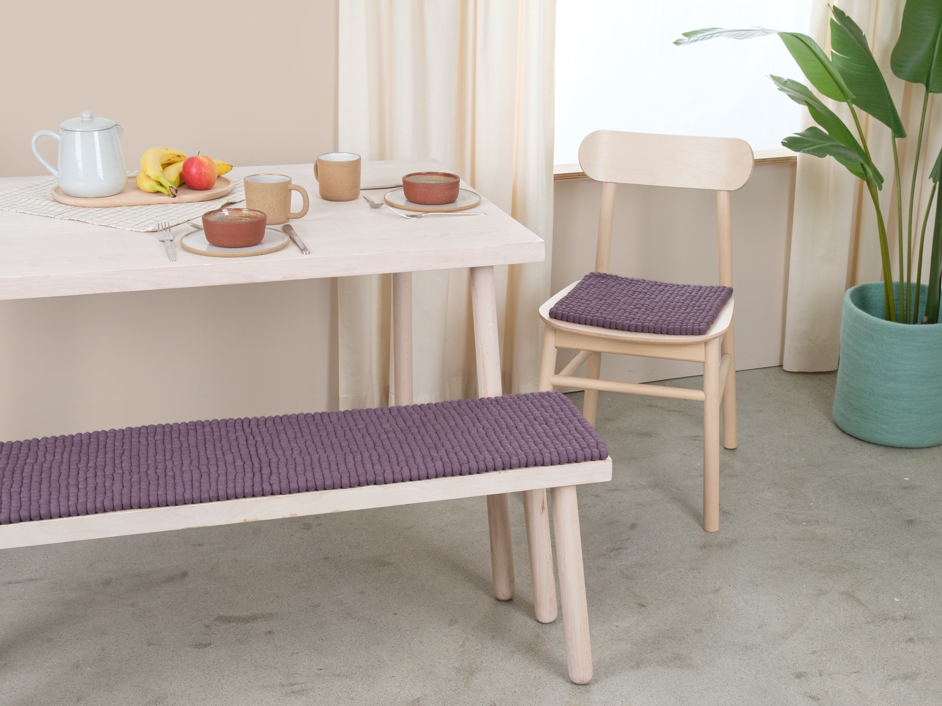 Coussin de banc en boules de feutre en violet, en pure laine vierge et dans la dimension de votre choix.