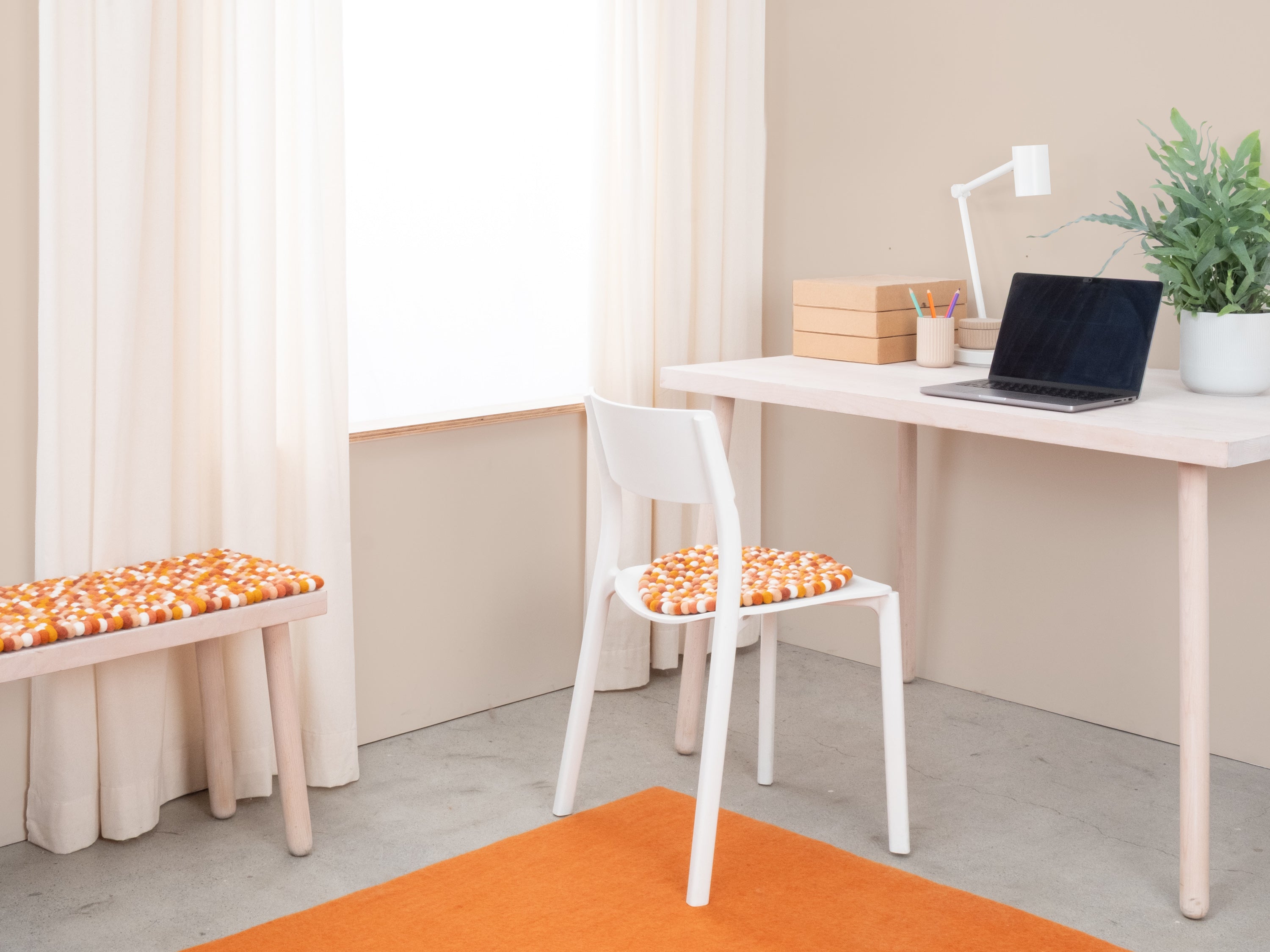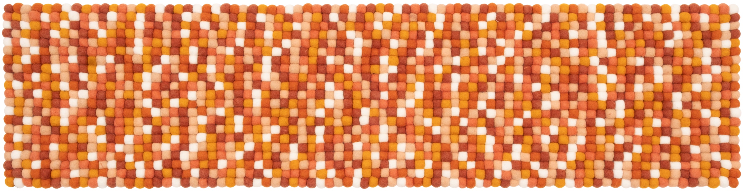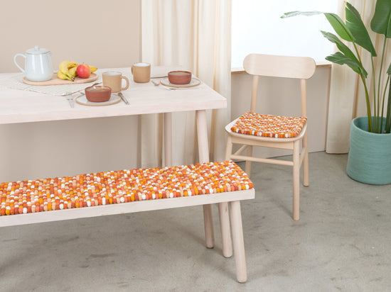 Coussin de banc en boules de feutre en multicolore, en pure laine vierge et dans la dimension de votre choix.