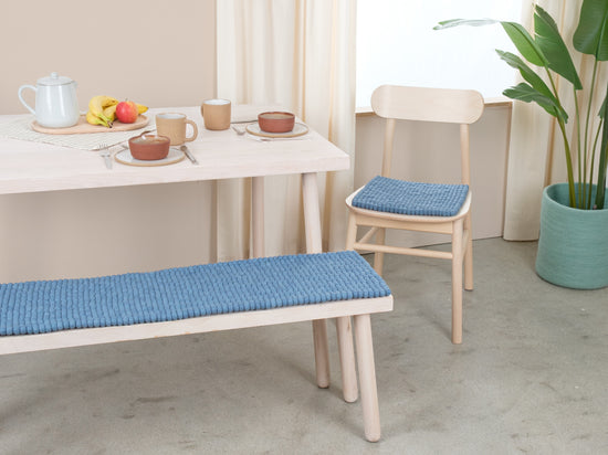 Coussin de banc en boules de feutre en bleu, en pure laine vierge et dans la dimension de votre choix.