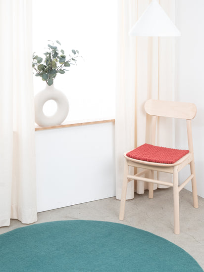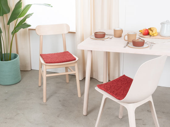 La galette d’assise rouge Kaja apporte chaleur et douceur à votre chaise préférée. Fabriquée en laine vierge pure, confectionnée à la main au Népal et produite dans des conditions équitables. Les galettes d’assise myfelt sont hydrofuges, résistantes aux salissures et utilisables des deux côtés.