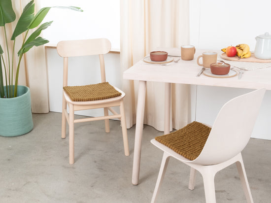 Carrée, galette d’assise couleur caramel en laine vierge pure.