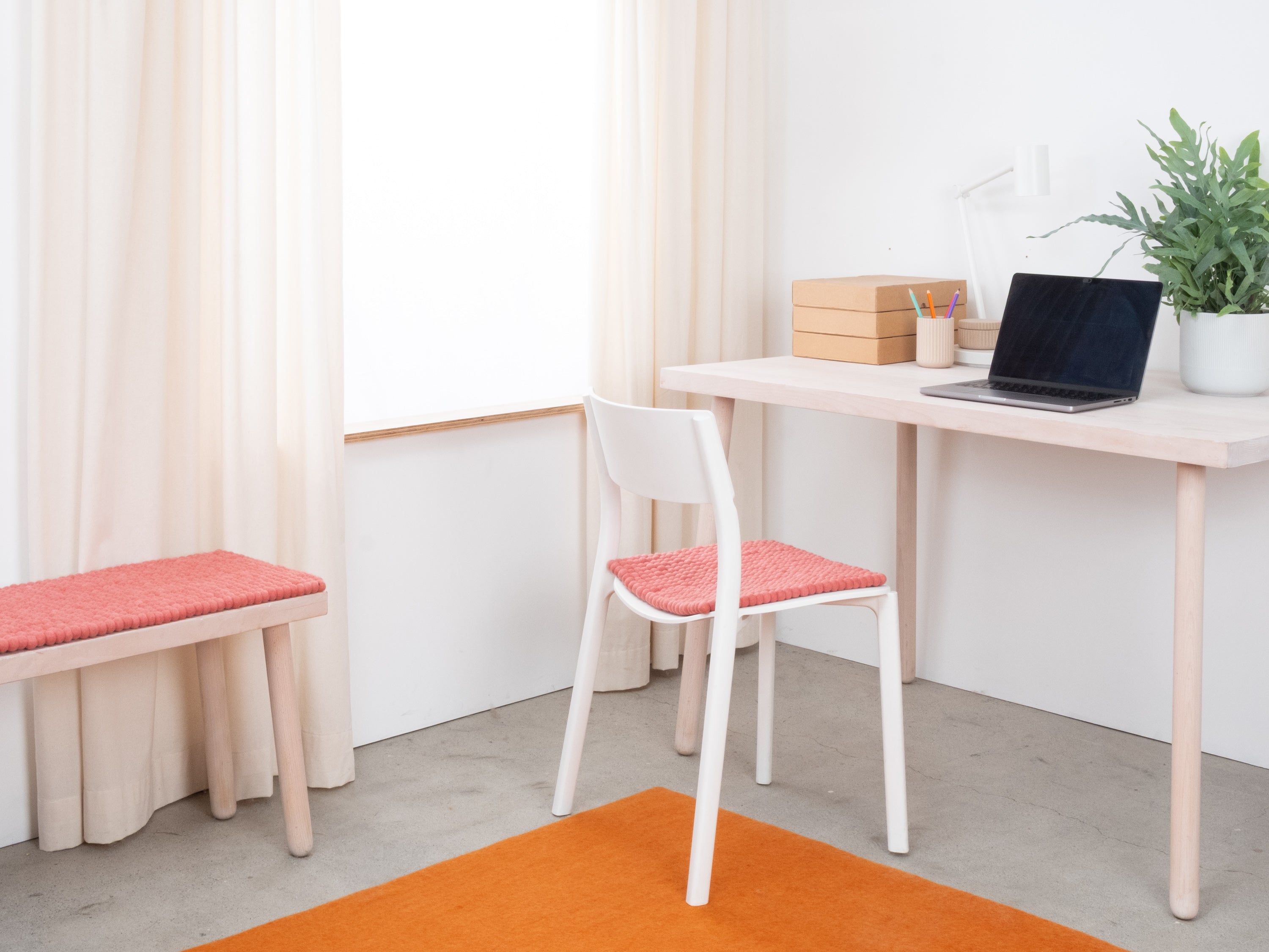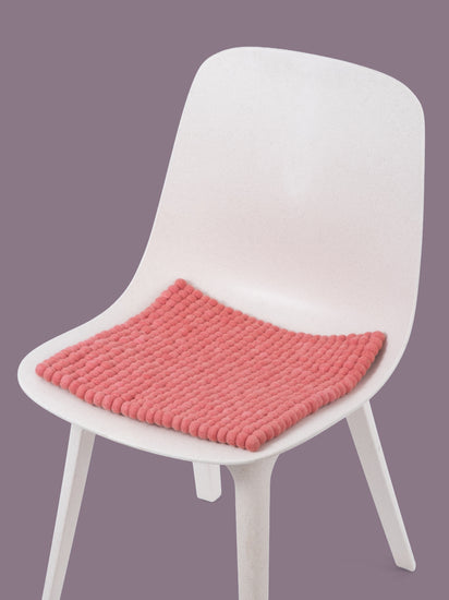 Carrée, galette d’assise rose corail en laine vierge pure.