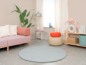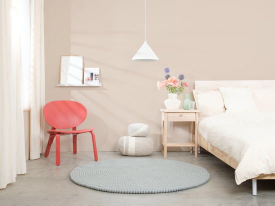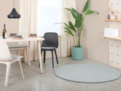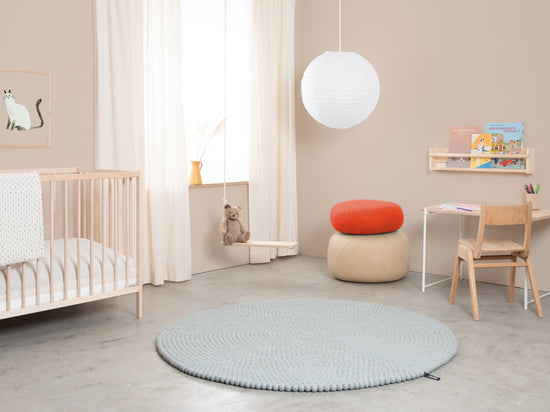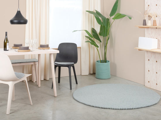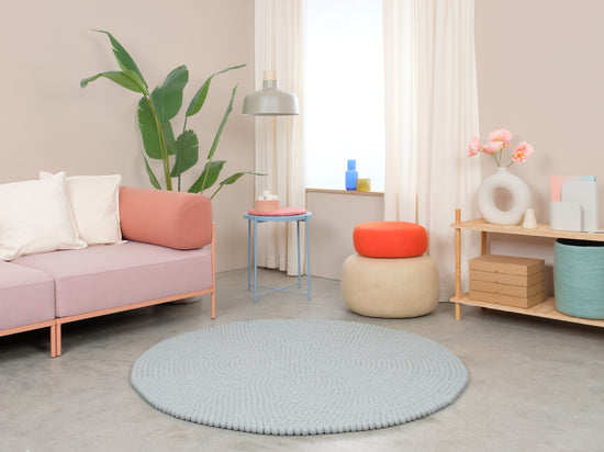 Liv est un tapis en boules de feutre d’un bleu clair et frais. Il apporte clarté et légèreté à la pièce et donne l’impression que les petits espaces paraissent plus grands. S’accorde avec le blanc, le chêne et les tons neutres – comme base apaisante ou accent frais. Doux, absorbant le son et naturellement anti-salissures. Fait main au Népal en pure laine vierge à 100 %.