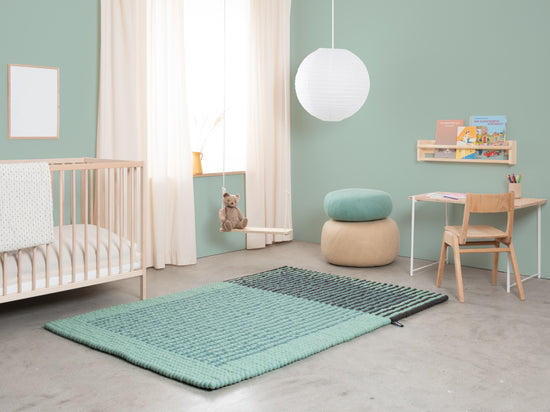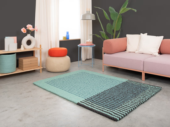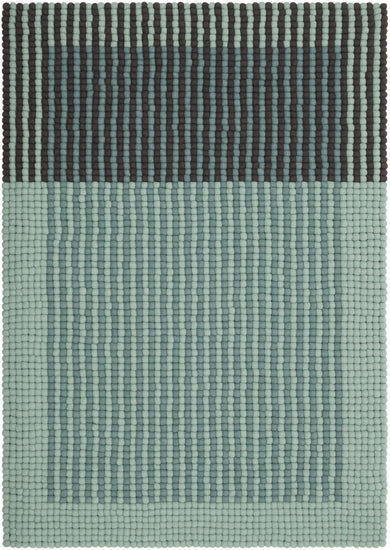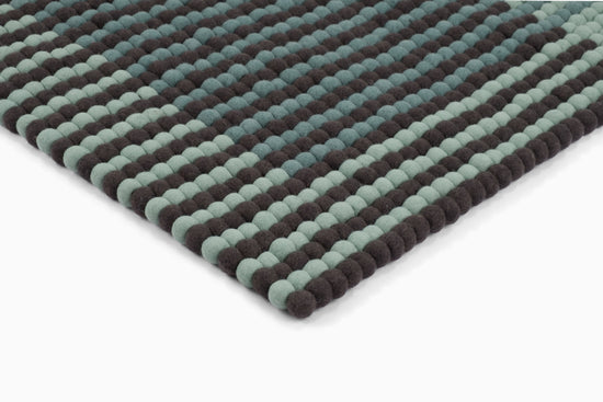 Tapis rectangulaire à boules de feutre, fabriqué en pure laine vierge.