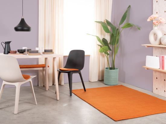 Afra insuffle un orange chaleureux à la pièce. Accueillant et énergisant sans être criard. Parfait pour réchauffer les espaces frais ou créer des accents. Robuste, facile d’entretien et agréable sous le pied. Fait main au Népal – 100 % laine vierge.