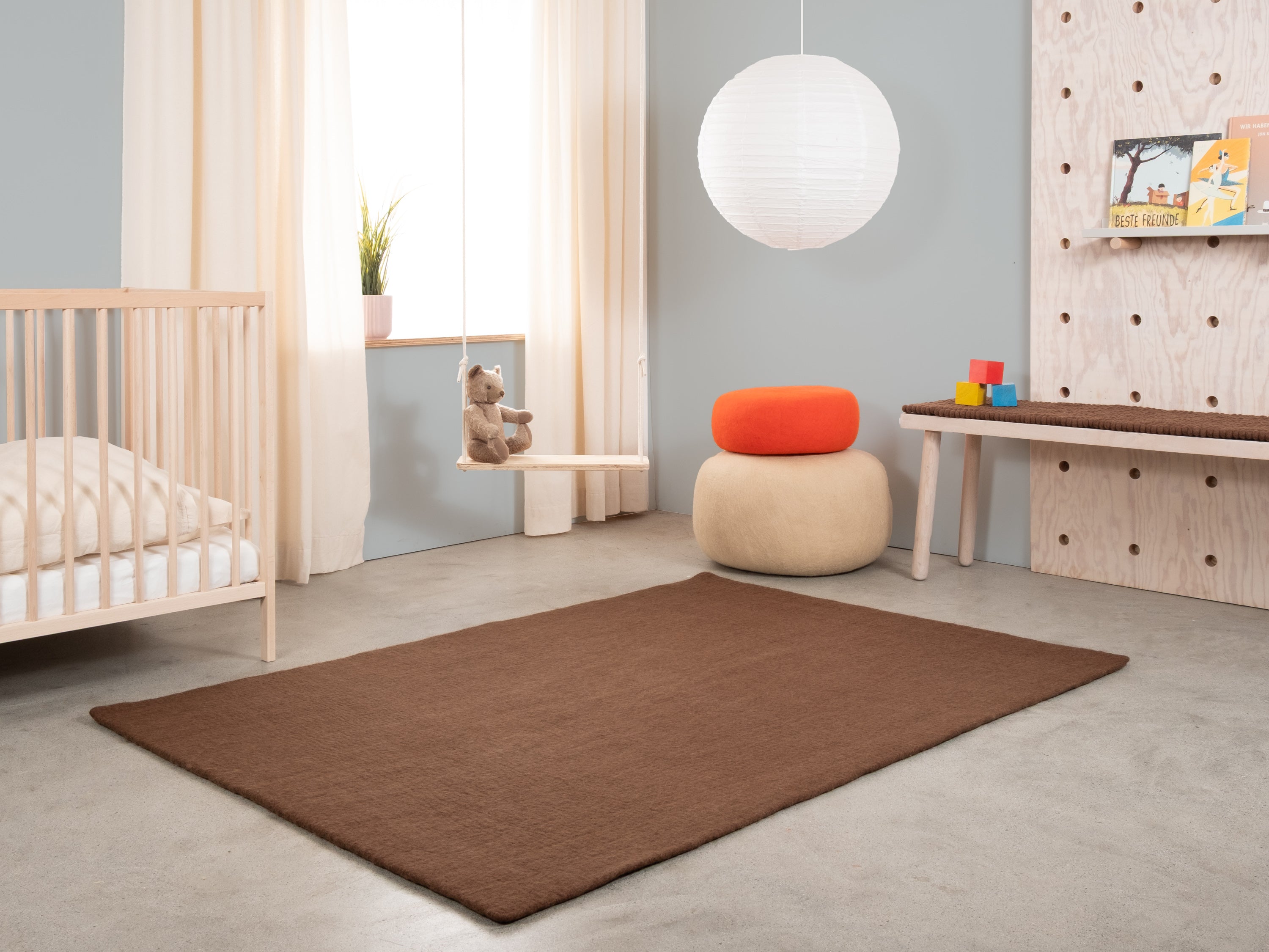 Egon mise sur un brun chocolat chaleureux. Le tapis en feutre ancre chaque pièce, apportant confort et structure. Idéal pour les coins lecture et les espaces de vie qui ont besoin de chaleur. Résistant, stable dans sa forme et agréable sous les pieds. Fait main au Népal – 100 % pure laine vierge.
