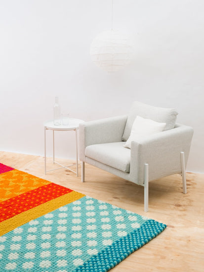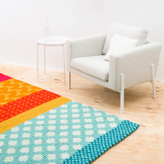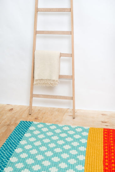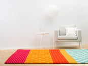 Tapis rectangulaire en boules de feutre fabriqué en laine vierge.