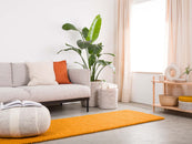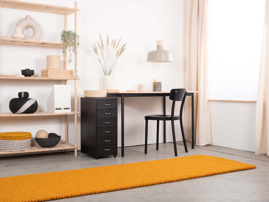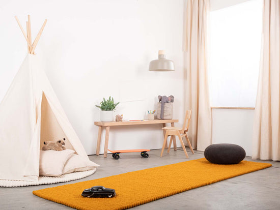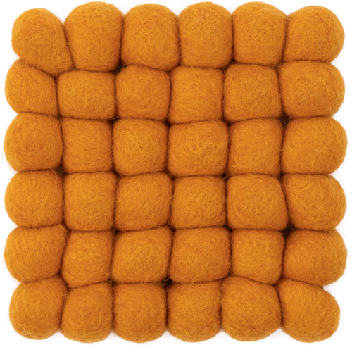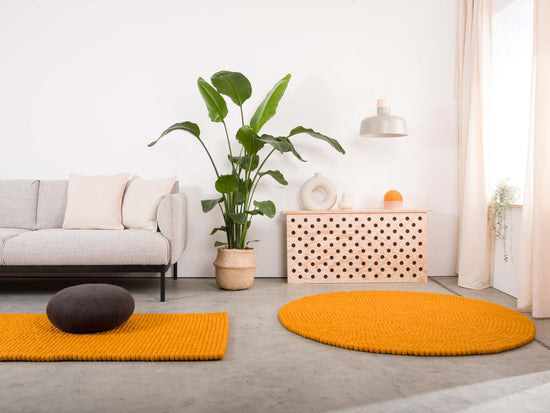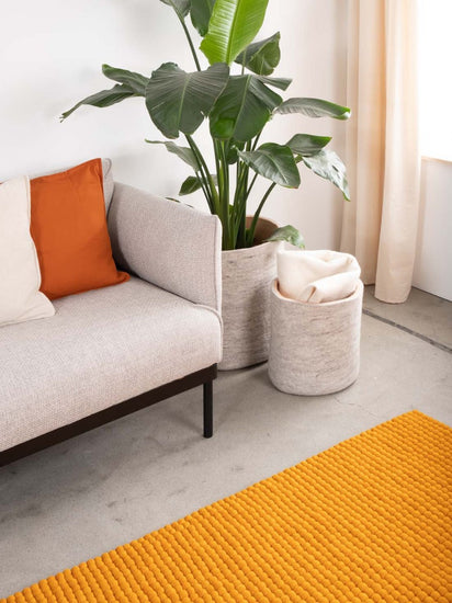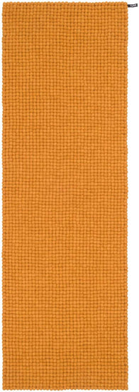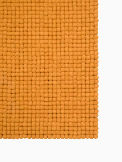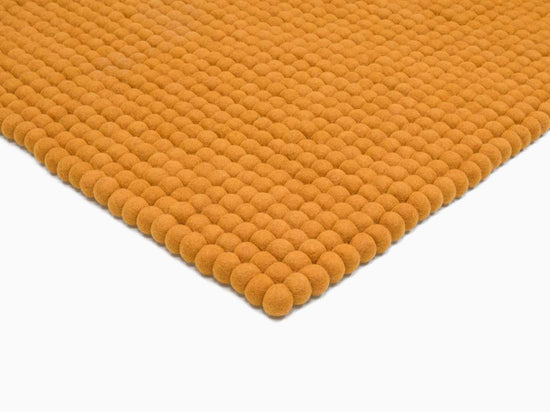 Tapis rectangulaire en boules de feutre couleur ocre jaune, en pure laine vierge.